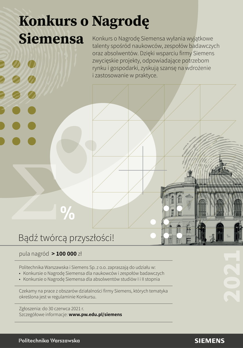 Szczegóły dotyczące zasad konkursu, regulamin oraz informacje o nagrodach dostępne są na stronie: www.pw.edu.pl/siemens.