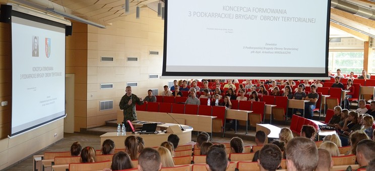 29 maja br. na auli Wydziału Mechaniczno-Technologicznego Politechniki Rzeszowskiej w Stalowej Woli odbył się wykład dotyczący koncepcji formowania 3 Podkarpackiej Brygady Obrony Terytorialnej. Wykład wygłosił płk. dypl. Arkadiusza Mikołajczyka, dowódcy 3 Podkarpackiej Brygady Obrony Terytorialnej. W prezentacji dotyczącej nowego rodzaju sił zbrojnych uczestniczyli m.in.: Poseł na Sejm RP Rafał Weber, Prorektor ds. nauki prof. dr hab. inż. Grzegorz Budzik i Dziekan Wydziału Mechaniczno-Technologicznego dr hab. inż. Aleksander Mazurkow. Na wykład przybyli także uczniowie klas mundurowych szkół ponadgimnazjalnych, studenci i zaproszeni goście.
