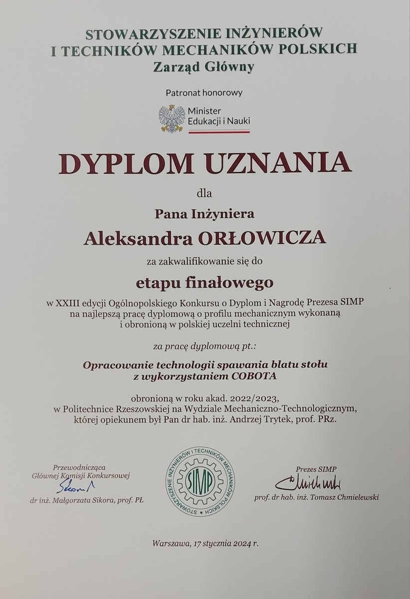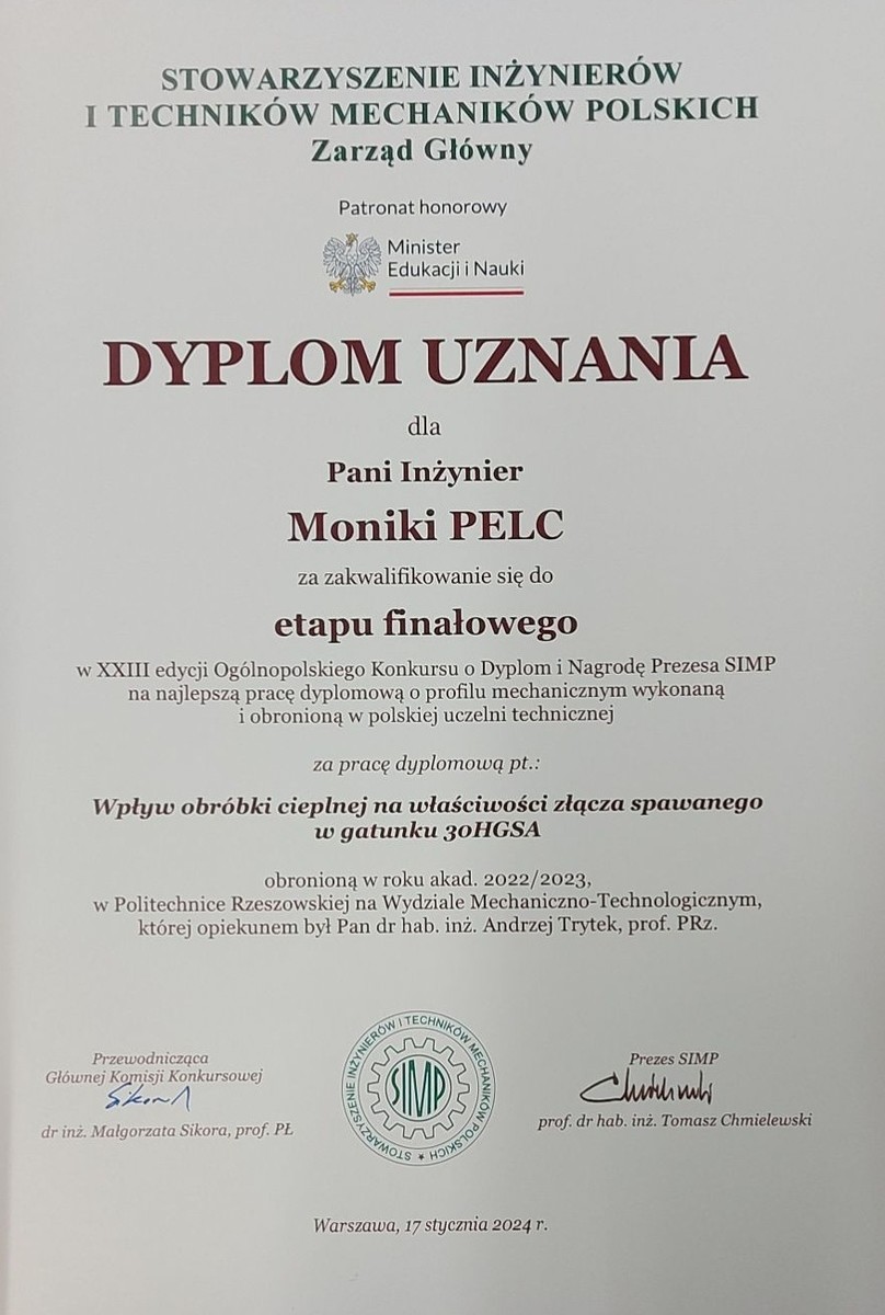 Absolwenci Politechniki Rzeszowskiej Wydziału Mechaniczno-Technologicznego w Stalowej Woli mgr inż. Monika Pelc oraz mgr inż. Aleksander Orłowicz znaleźli się w ścisłym finale XXIII EDYCJI OGÓLNOPOLSKIEGO KONKURSU o dyplom i nagrodę Prezesa SIMP na najlepszą pracę dyplomową o profilu mechanicznym wykonaną i obronioną w krajowej wyższej szkole technicznej w roku akademickim 2022/2023.