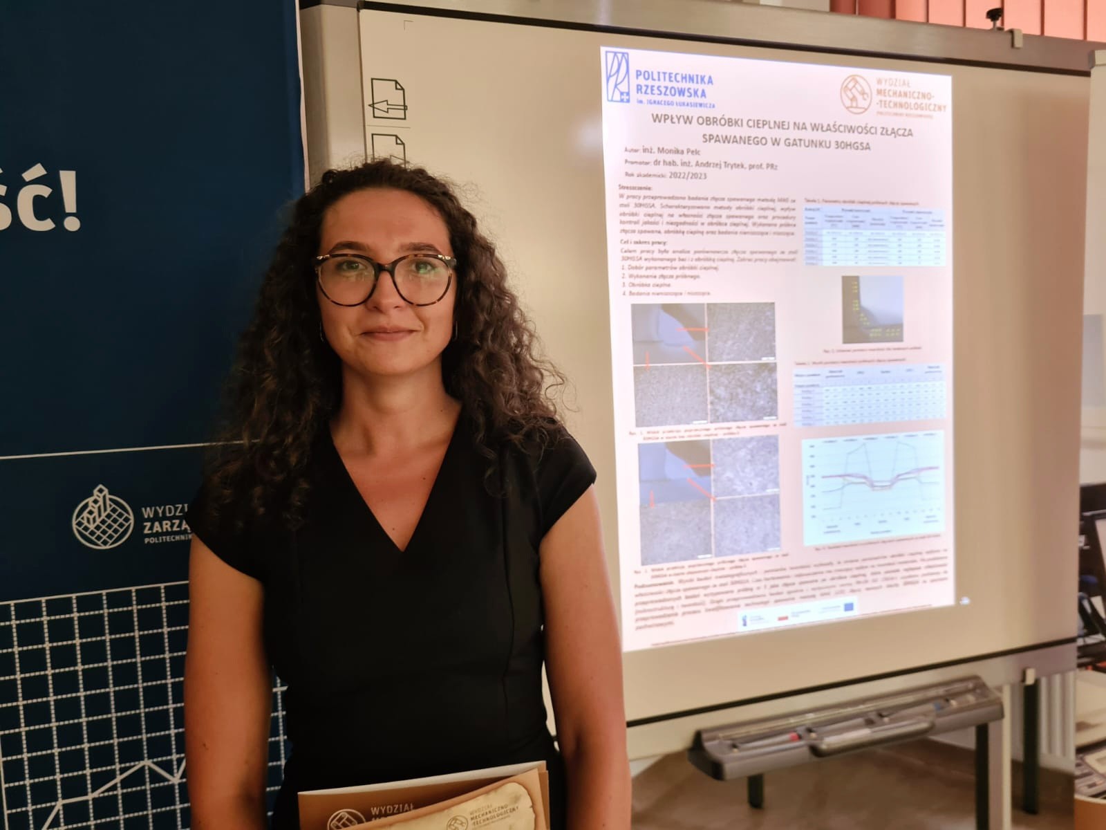Mgr inż. Monika Pelc swoją pracę dyplomową poświęciła zbadaniu wpływu obróbki cieplnej na właściwości złącza spawanego ze stali w gatunku 30HGSA, natomiast mgr inż. Aleksander Orłowicz zajął się opracowaniem technologii spawania blatu stołu z wykorzystaniem cobota.