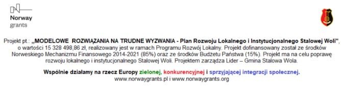 Realizowane jest w ramach projektu - MODELOWE ROZWIĄZANIA NA TRUDNE WYZWANIA - Plan Rozwoju Lokalnego I Instytucjonalnego Stalowej Woli; w ramach programu Rozwój Lokalny, finansowane ze środków Norweskiego Mechanizmu Finansowego 2014-2021 (85%) oraz Budżetu Państwa (15%).