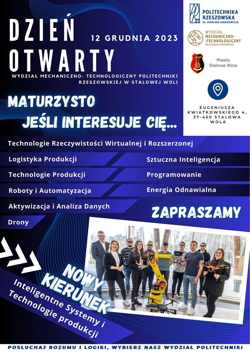Już 12 grudnia, tj. wtorek, od godz. 9:00 zapraszamy wszystkich ciekawskich, licealistów, uczniów techników, pracowników pobliskich i dalszych firm, a przede wszystkim maturzystów do zapoznania się z oferta naszego Wydziału.