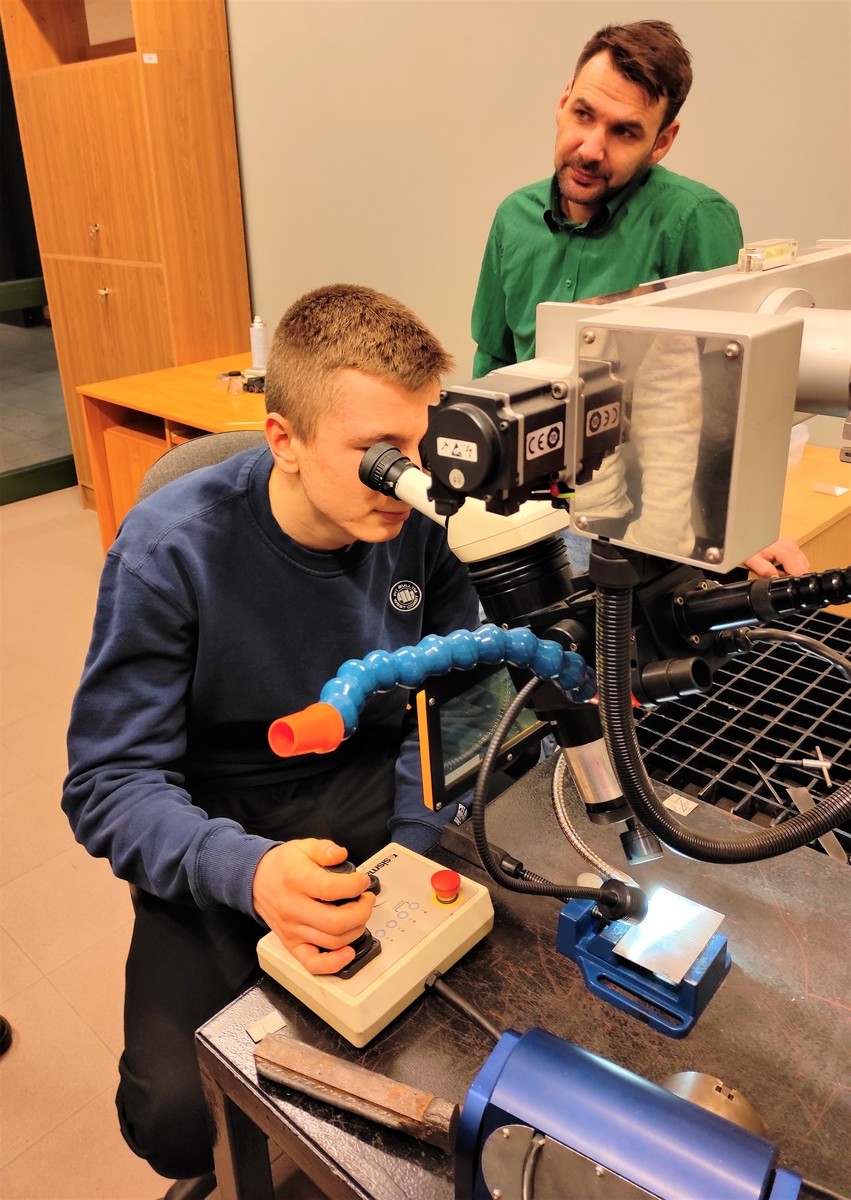 Ostatnim punktem zorganizowanych zajęć, było zwiedzanie pracowni mikronapawania laserowego SISMA SWA 300. Tutaj już sami mogli popróbować pracy na takim stanowisku, które wyposażone jest w zestaw urządzeń i narzędzi przeznaczonych do precyzyjnego napawania form wtryskowych, tłoczników, wykrojników, modeli, płyt modelowych, form metalowych z wykorzystaniem wiązki laserowej.