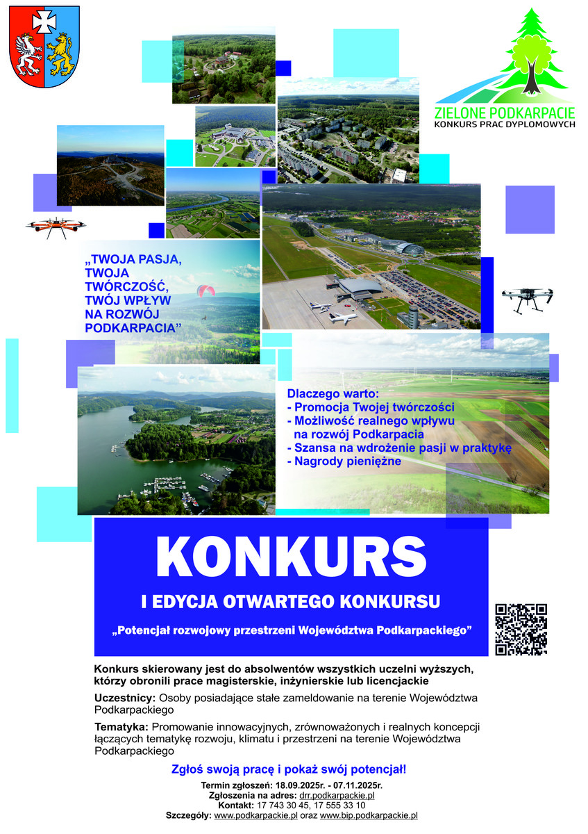 Z ogromną przyjemnością zapraszamy do udziału w pierwszej edycji otwartego Konkursu na najlepszą pracę dyplomową pn. „Potencjał rozwojowy przestrzeni Województwa Podkarpackiego", ogłoszonego przez Zarząd Województwa Podkarpackiego.