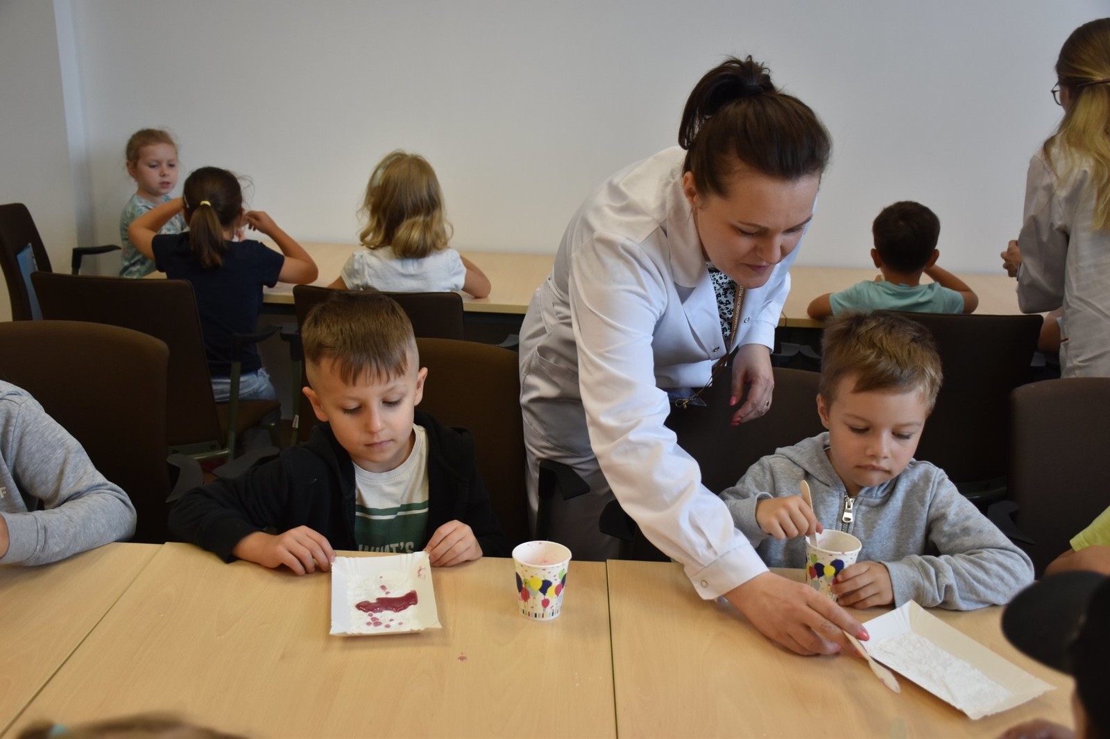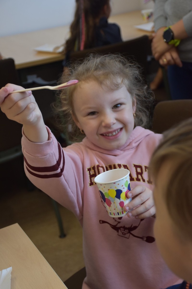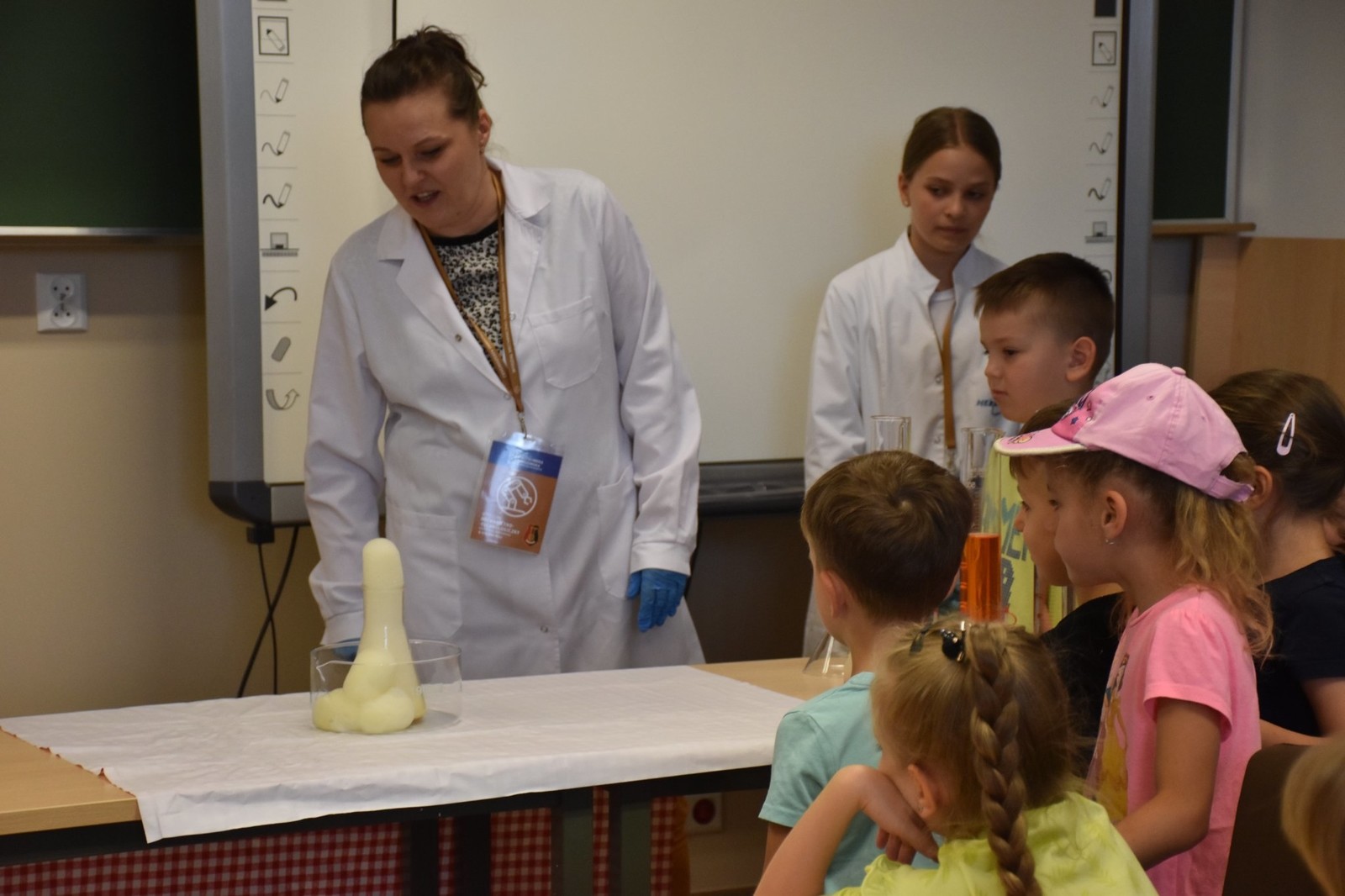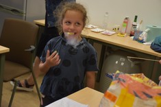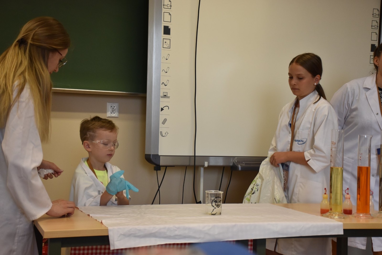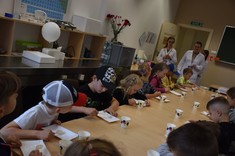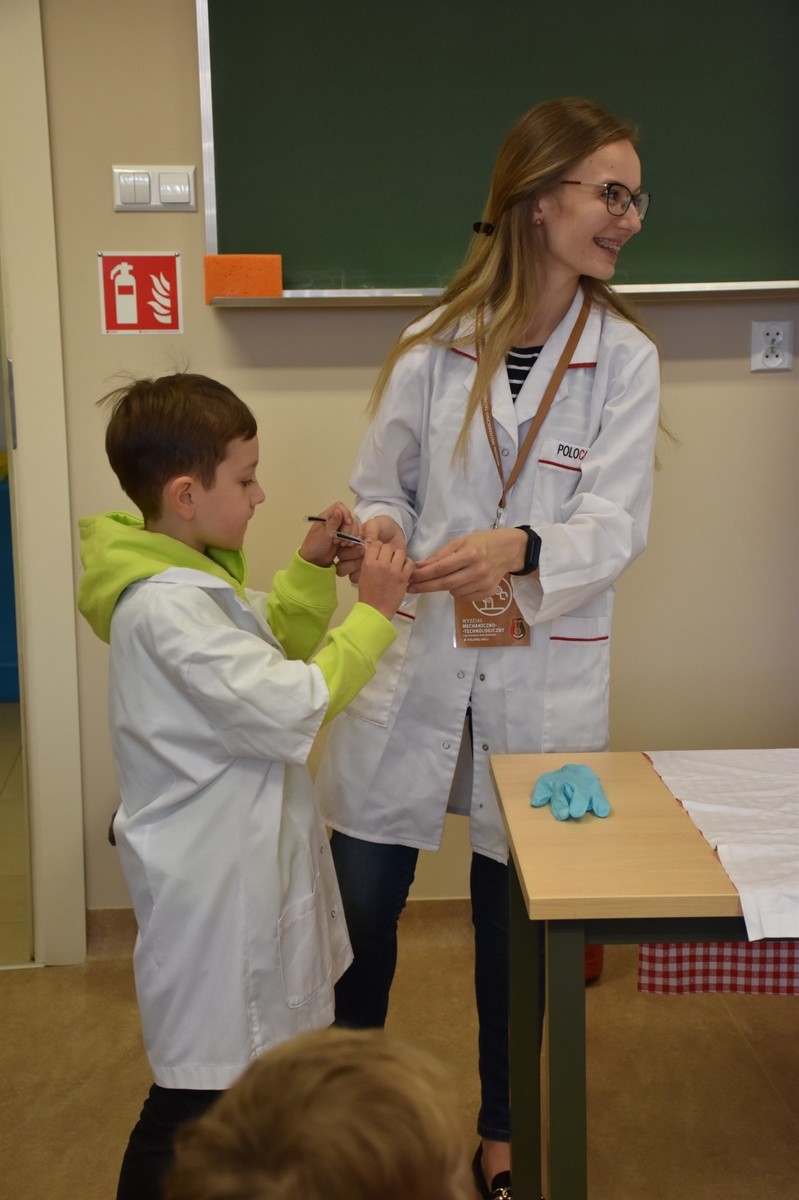 Podczas zajęć dzieci samodzielnie wykonały pyszne żelki owocowe. Następnie asystenci (wybrani spośród przedszkolaków) czarowali wodę. Za pomocą kilku kropelek różnych odczynników chemicznych zmieniali kolor wody. Dzieci wywołały również ducha chemicznego, któremu nadały specjalne imię. „Kacperek” wyszedł z magicznej menzurki wywołując uśmiechy i zdziwienie na twarzach uczestników. Następni asystenci pomogli w karmieniu chemicznego potwora styropianowymi przysmakami, obudzeniu pianowego stwora, dodawaniu odwagi chemicznemu kameleonowi, który nawet kilkukrotnie zmieniał barwę. Na koniec tej części zajęć przedszkolaki miały okazję spróbować, jak smakują lodowe chrupki kukurydziane zmrożone ciekłym azotem. Po zjedzeniu tych lodów dzieci na chwilę zamieniły się w smoki.