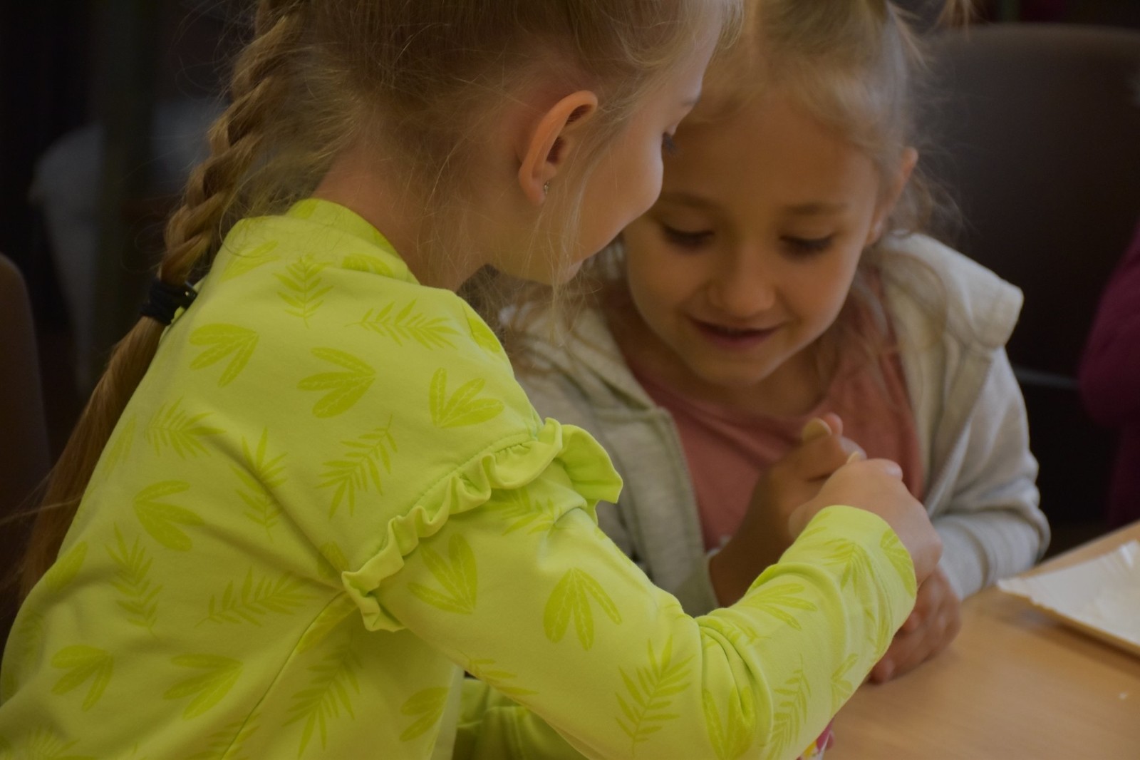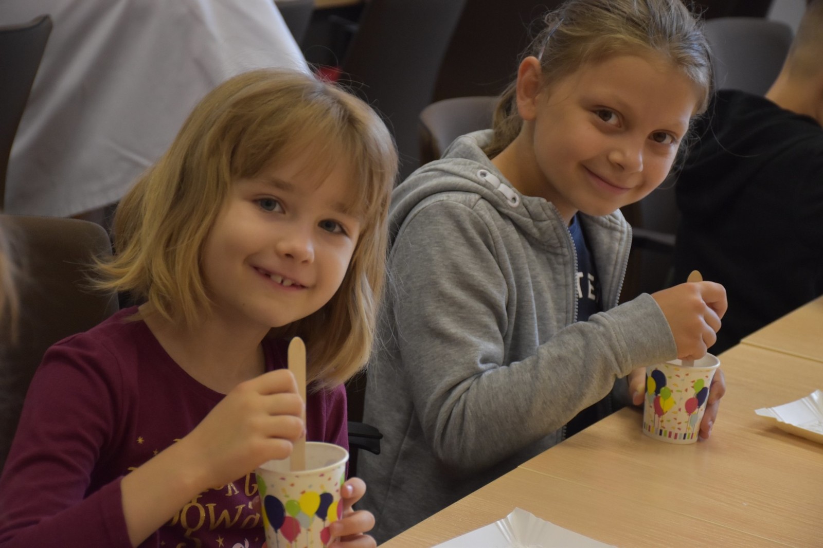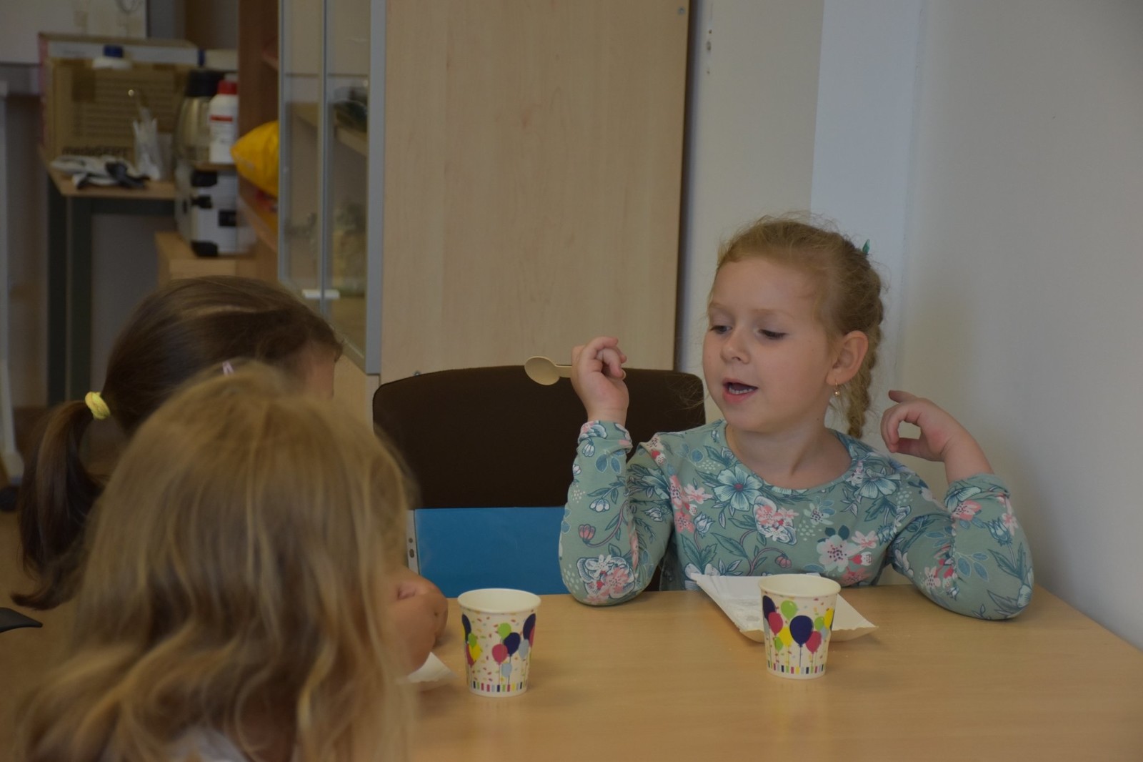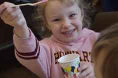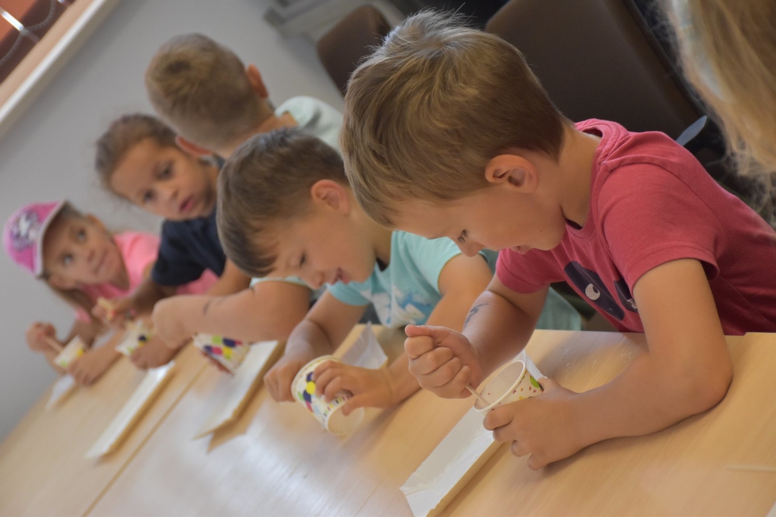 Podczas zajęć dzieci samodzielnie wykonały pyszne żelki owocowe. Następnie asystenci (wybrani spośród przedszkolaków) czarowali wodę. Za pomocą kilku kropelek różnych odczynników chemicznych zmieniali kolor wody. Dzieci wywołały również ducha chemicznego, któremu nadały specjalne imię. „Kacperek” wyszedł z magicznej menzurki wywołując uśmiechy i zdziwienie na twarzach uczestników. Następni asystenci pomogli w karmieniu chemicznego potwora styropianowymi przysmakami, obudzeniu pianowego stwora, dodawaniu odwagi chemicznemu kameleonowi, który nawet kilkukrotnie zmieniał barwę. Na koniec tej części zajęć przedszkolaki miały okazję spróbować, jak smakują lodowe chrupki kukurydziane zmrożone ciekłym azotem. Po zjedzeniu tych lodów dzieci na chwilę zamieniły się w smoki.