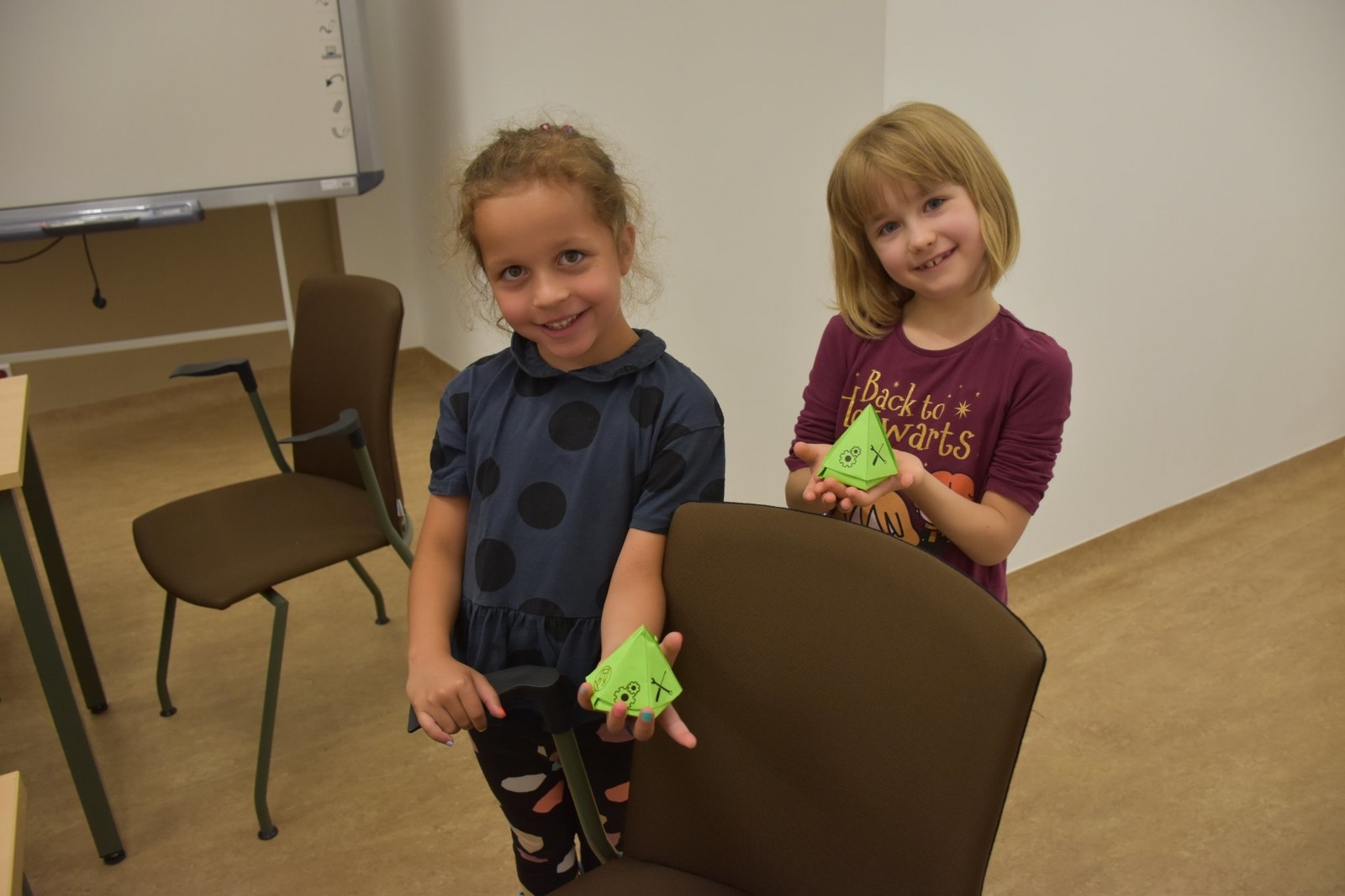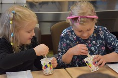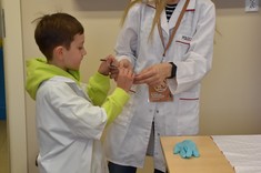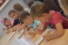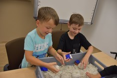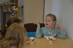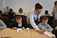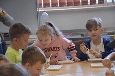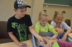 W kolejnym bloku zajęć dzieci poznały "Bryłki bez kleju". Jest to projekt, który został zrealizowany przez Panią dr Weronikę Woś wraz ze studentami pierwszego roku kierunku zarządzanie i inżynieria produkcji naszego Wydziału. Bryłki bez kleju mogą służyć jako materiały pomocnicze do nauki matematyki w szkołach, w szczególności na lekcjach z działu stereometria. Poza tym "Bryłki bez kleju" są po prostu świetną zabawą. Wystarczy pobrać dowolny gotowy schemat, wydrukować go i wyciąć. Następnie kartkę należy pozaginać wzdłuż zaznaczonych linii. Kierunek wszystkich zagięć jest ten sam, tj. „do środka”. Mając tak przygotowaną kartkę pozostaje ją odpowiednio złożyć, aby uzyskać gotową przestrzenną bryłę bez użycia kleju (https://knip.prz.edu.pl/projekty/brylki-bez-kleju).