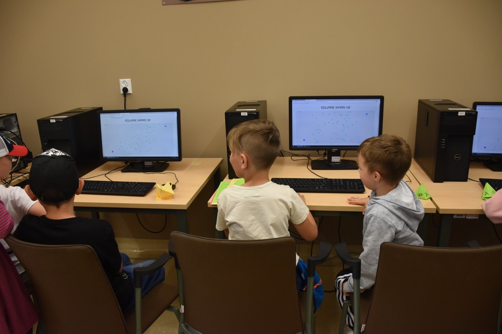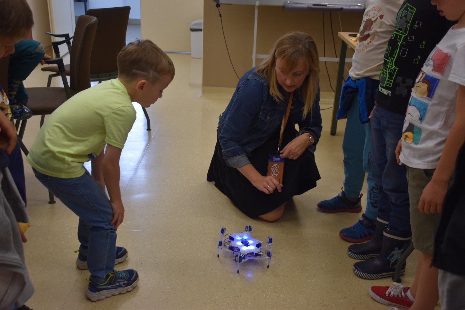 Nutkę rywalizacji można było zaobserwować podczas grania w Square Wars. To studencki projekt gry internetowej wykonanej w technologii HTML, CSS, JS. Celem projektu jest nauka tworzenia profesjonalnych aplikacji internetowych, które łączą w sobie elementy modelowania i wizualizacji (https://knip.prz.edu.pl/projekty/square-wars). Ten blok zajęć zakończył się zabawą z pająkiem-robotem, który zaprezentował dla Drużyny Misia swój wyjątkowy układ taneczny.