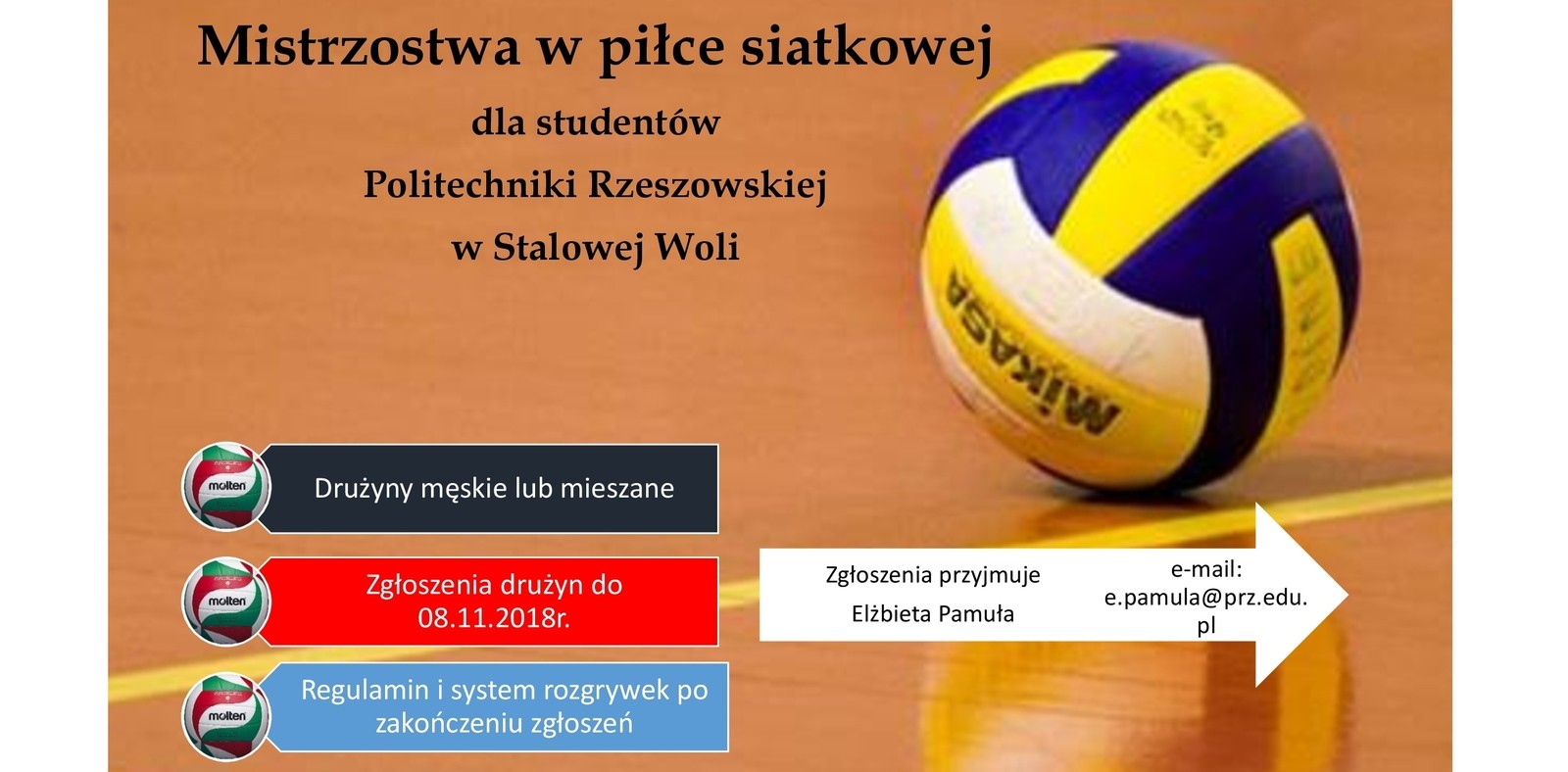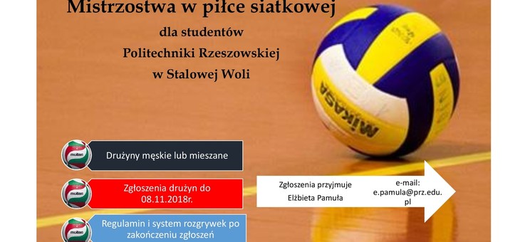 Zapraszam studentów I II i III roku do wzięcia udziału w rozgrywkach o Mistrzostwo Politechniki Rzeszowskiej w Stalowej Woli w piłce siatkowej. W rozgrywkach biorą udział reprezentacje wszystkich kierunków (dopuszcza się zgłoszenia składów mieszanych - kobiety, mężczyźni). Nazwy drużyn powinny być związane z uczelnią, kierunkiem i podlegać będą weryfikacji.