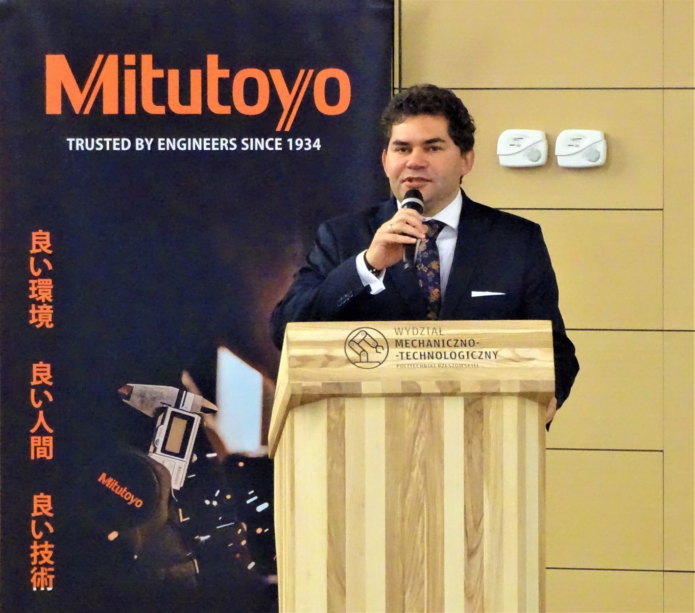 Wszystkich gości przywitał Dziekan WMT Andrzej Trytek, a każdy z nich zabrał głos podkreślając korzyści płynące z umowy zarówno dla Wydziału, jak i lokalnego przemysłu. Pan Dyrektor Sprzedaży Mitutojo Polska Michał Rutkowski przedstawił historię firmy Mitutoyo i jej ekspansję rynków na całym świecie. Prelegentem był również dr Andrzej Chmielowiec, który mówił o planach utworzenia nowego kierunku i interdyscyplinarnym zespole badawczym ukierunkowanym na inteligentne systemy predykcyjne w przemyśle.