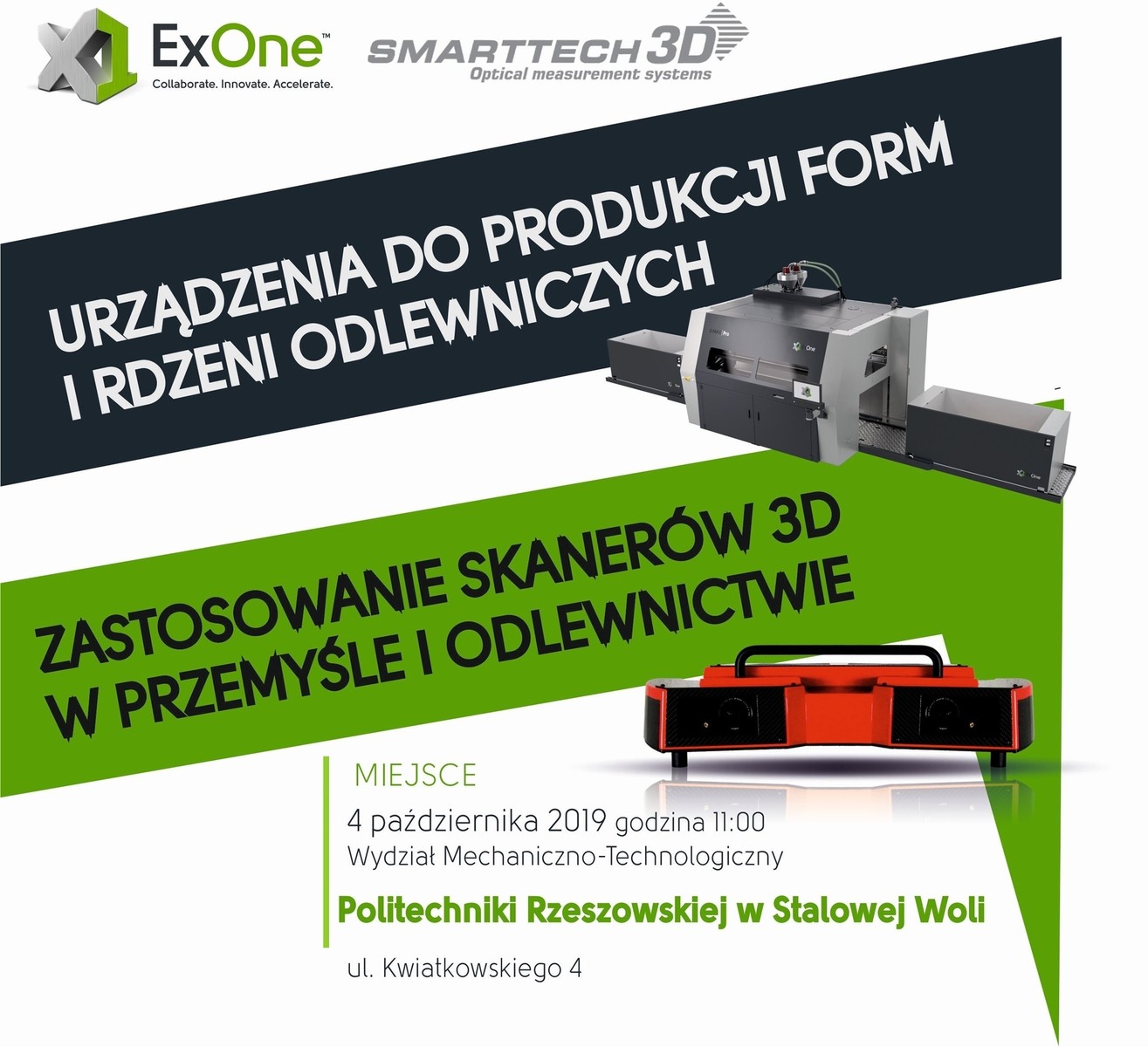 W trakcie spotkania dowiedzą się Państwo o przemysłowym druku 3D z piasku i metalu oraz zagadnieniach związanych ze skanowaniem 3D czyli kontrolą jakości, inżynierią odwrotną. Prelegenci przygotowali dla Państwa interesujące prezentacje, które dokładnie wyjaśniają podejście technologiczne, konkretne przykłady zastosowań jak, dostępne urządzenia jak i część praktyczną. ExOne zaprezentuje prawdziwe wydruki 3D z piasku oraz metalu, natomiast Smarttech 3D przeprowadzi krótkie warsztaty gdzie będzie można zobaczyć jak działają skanery 3D.