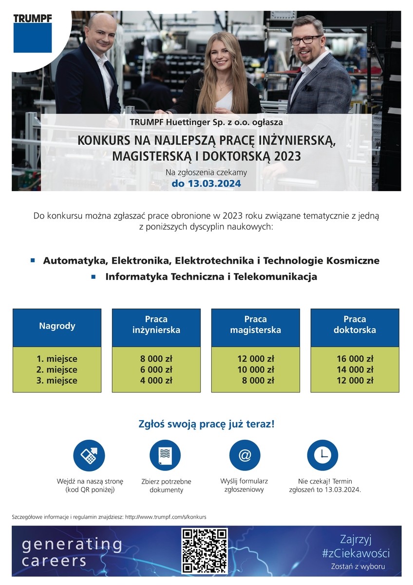 Na Twoje zgłoszenie czekamy do 13 marca 2024 r. Do tego czasu należy wypełnić formularz zgłoszeniowy, zebrać wszystkie potrzebne dokumenty i przesłać je na nasz adres: konkurs@trumpf.com.