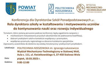Powiat Stalowowolski wraz z Wydziałem Mechaniczno– Technologicznym Politechniki Rzeszowskiej w Stalowej Woli organizuje konferencję dla Dyrektorów Szkół Ponadpodstawowych.