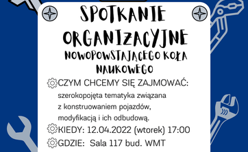 Spotkanie organizacyjne nowopowstającego koła naukowego odbędzie się 12.04.2022 o godz. 17:00 w sali 117 bud. WMT. Zapraszamy wszystkich zainteresowanych.