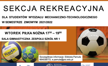 Zapraszamy wszystkich studentów Wydziału Mechaniczno - Technologicznego na zajęcia sekcji rekreacyjnej we wtorki o godz.17.30. Sala gimnastyczna Zespołu Szkół nr 1.