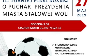 Zapraszamy na III Turniej Piłki Nożnej o Puchar Prezydenta Miasta Stalowej Woli organizowany jest przez Wydział Mechaniczno-Technologiczny Politechniki Rzeszowskiej. 27.05.2019r. - stadion MOSiR