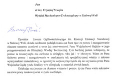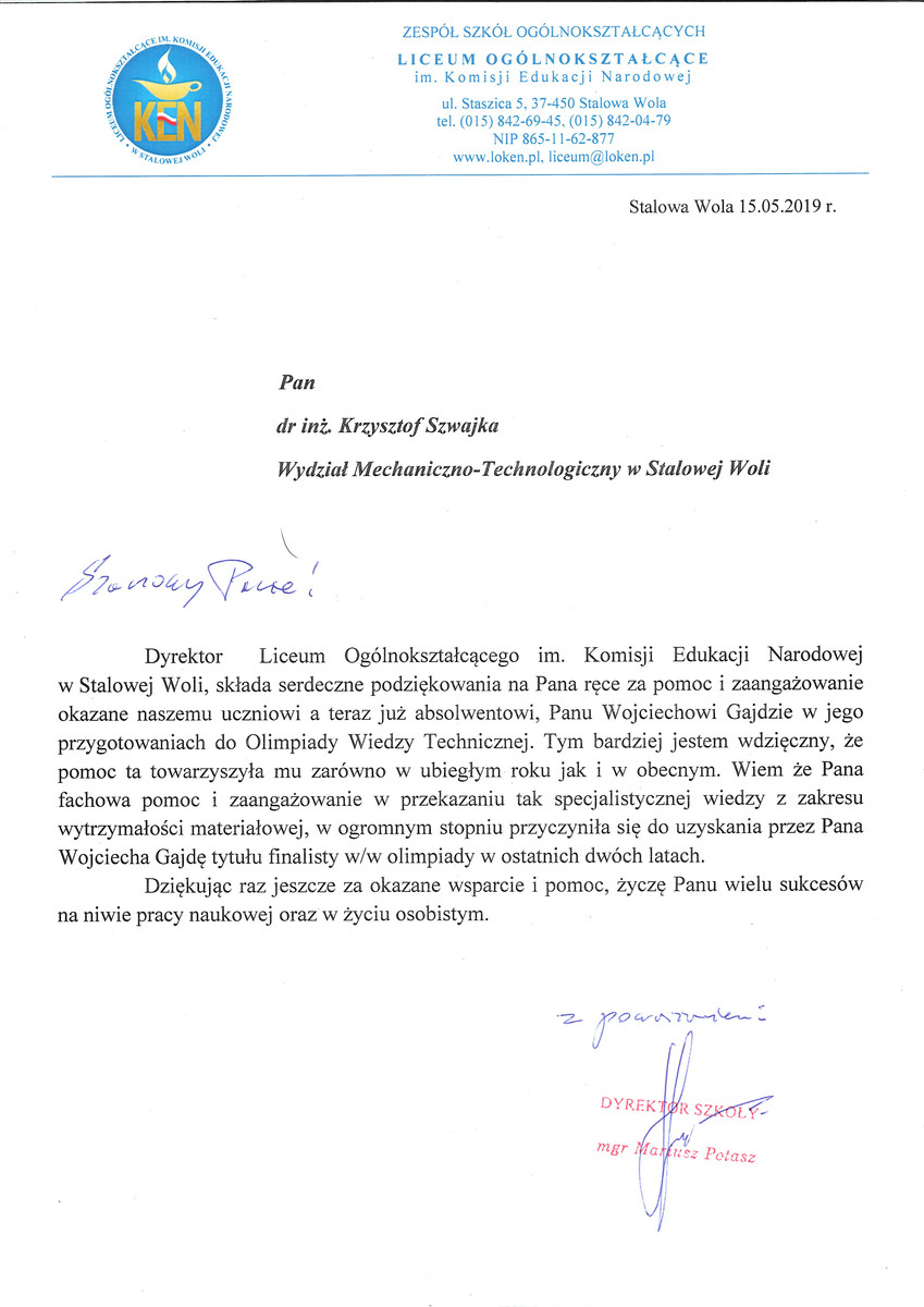 Jest nam tym bardziej miło z uwagi na fakt, że osobą odpowiedzialną za wsparcie merytoryczne w przygotowywaniu do udziału w obu olimpiadach był adiunkt Wydziału Mechaniczno-Technologicznego Politechniki Rzeszowskiej dr inż. Krzysztof SZWAJKA.