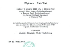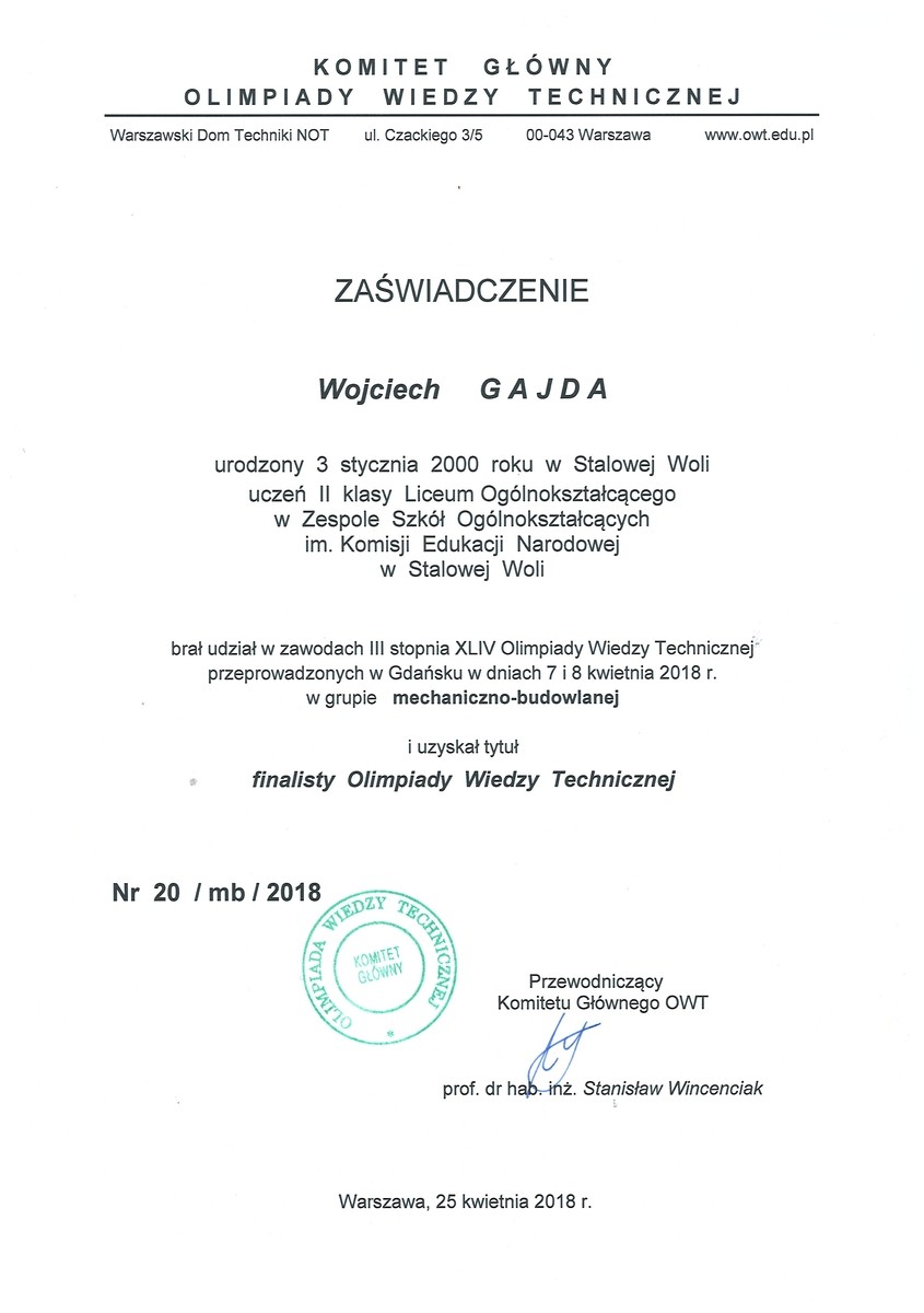Z przyjemnością informujemy, że Wojciech GAJDA uczeń Liceum Ogólnokształcącego im. Komisji Edukacji Narodowej w Stalowej Woli już po raz drugi uzyskał tytuł finalisty Olimpiady Wiedzy Technicznej w grupie mechaniczno-budowlanej. Po raz pierwszy w roku 2018 na XLIV OWT w Gdańsku oraz w 2019 roku na XLV OWT w Kaliszu.