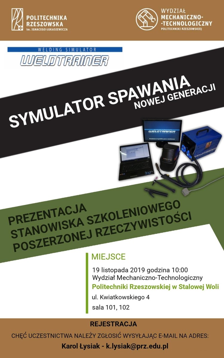Wydział Mechaniczno-Technologiczny w Stalowej Woli zaprasza na seminarium, podczas którego zostanie przedstawiony symulator spawania nowej generacji. Seminarium odbędzie się 19.11.2019 o godz. 10.00 w budynku WMT w Stalowej Woli przy ul. Kwiatkowskiego 4.