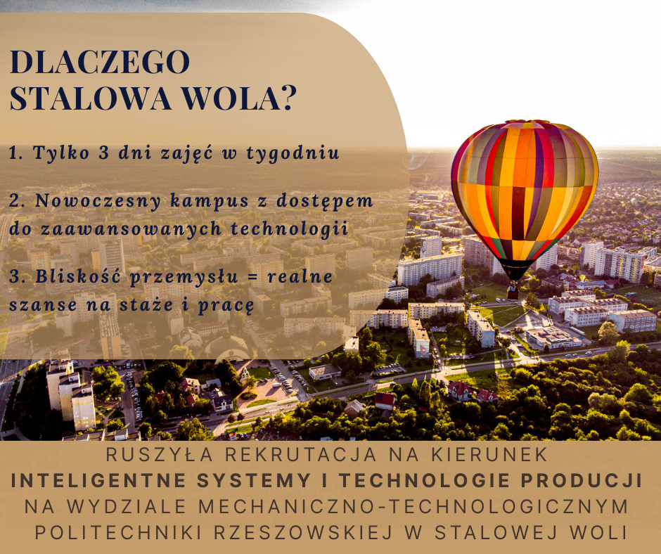 Politechnika Rzeszowska prowadzi rekrutację uzupełniającą na kierunku Inteligentne Systemy i Technologie Produkcji na Wydziale Mechaniczno- Technologicznym.