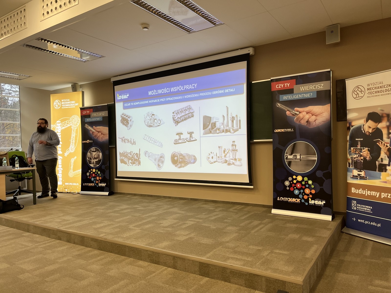 Na wstępie uczestnicy spotkania mogli zapoznać się z profilem firmy. W dalszej kolejności przedstawiony został temat związany z przemysłem 4.0. Tematyka ta znakomicie wpisuje się w profile obydwu kierunków, a w szczególności kierunku Inteligentne systemy i technologie produkcji. Kolejna część została poświęcona najnowocześniejszym rozwiązaniom narzędziowym z kampanii LOGIQUICK. Kampania ta reklamowana jest pod hasłem „Czy Ty obrabiasz inteligentnie? A zatem i te rozwiązania jak najbardziej komponują się z efektami kształcenia na najmłodszym kierunku studiów prowadzonym na Wydziale Mechaniczno-Technologicznym.