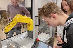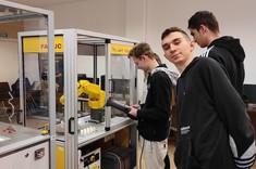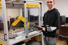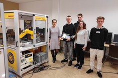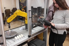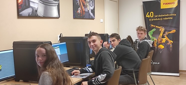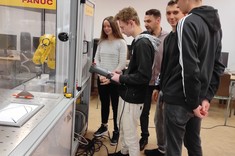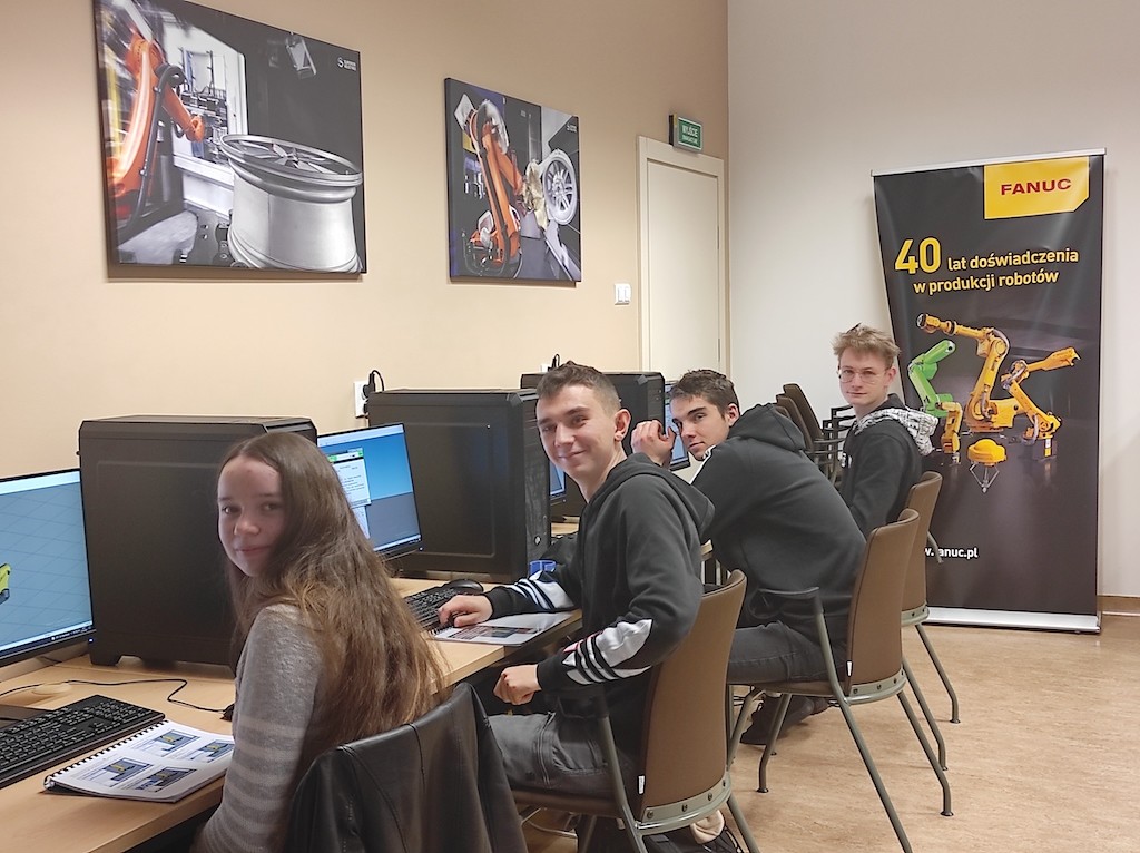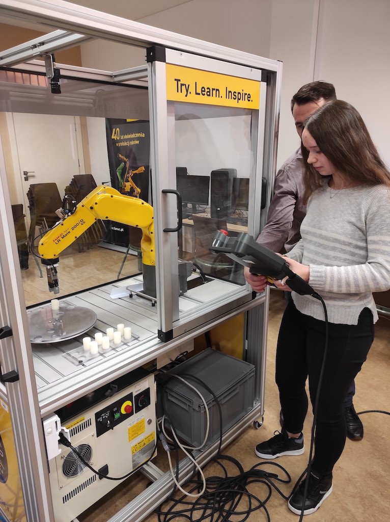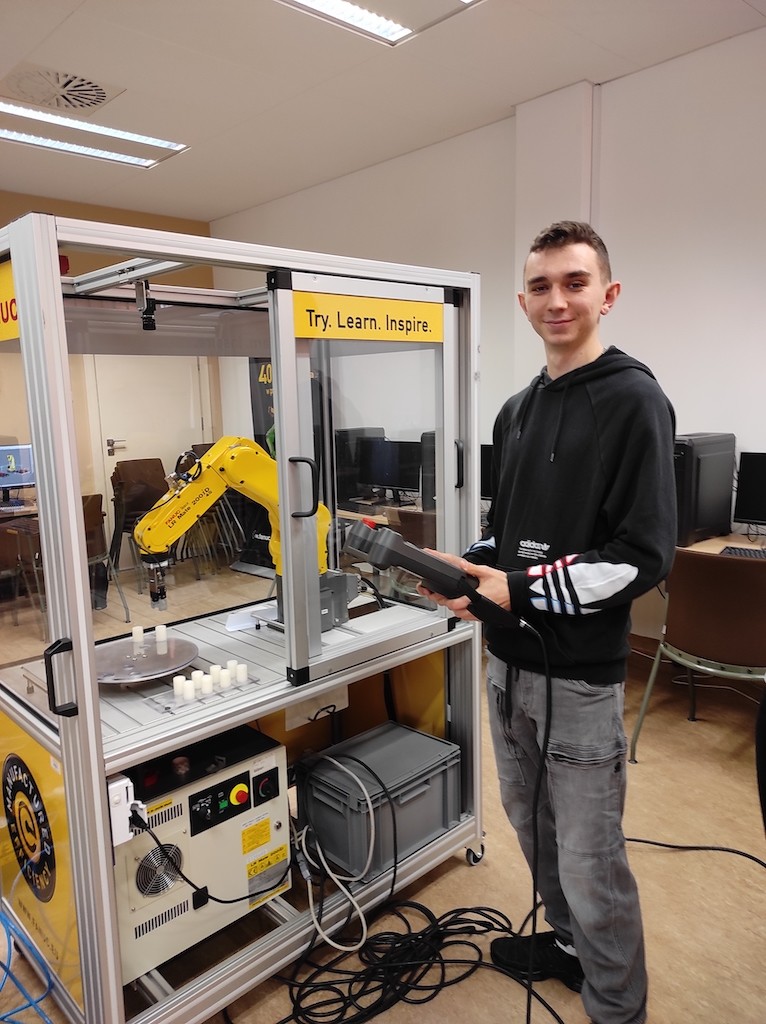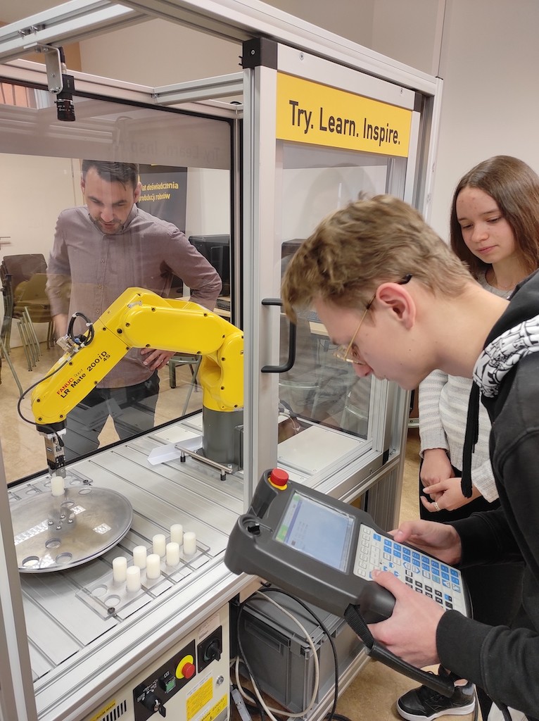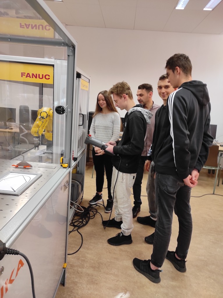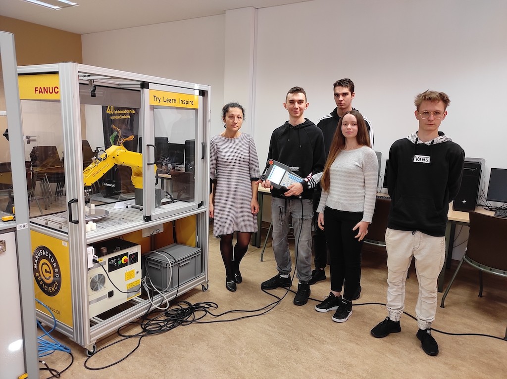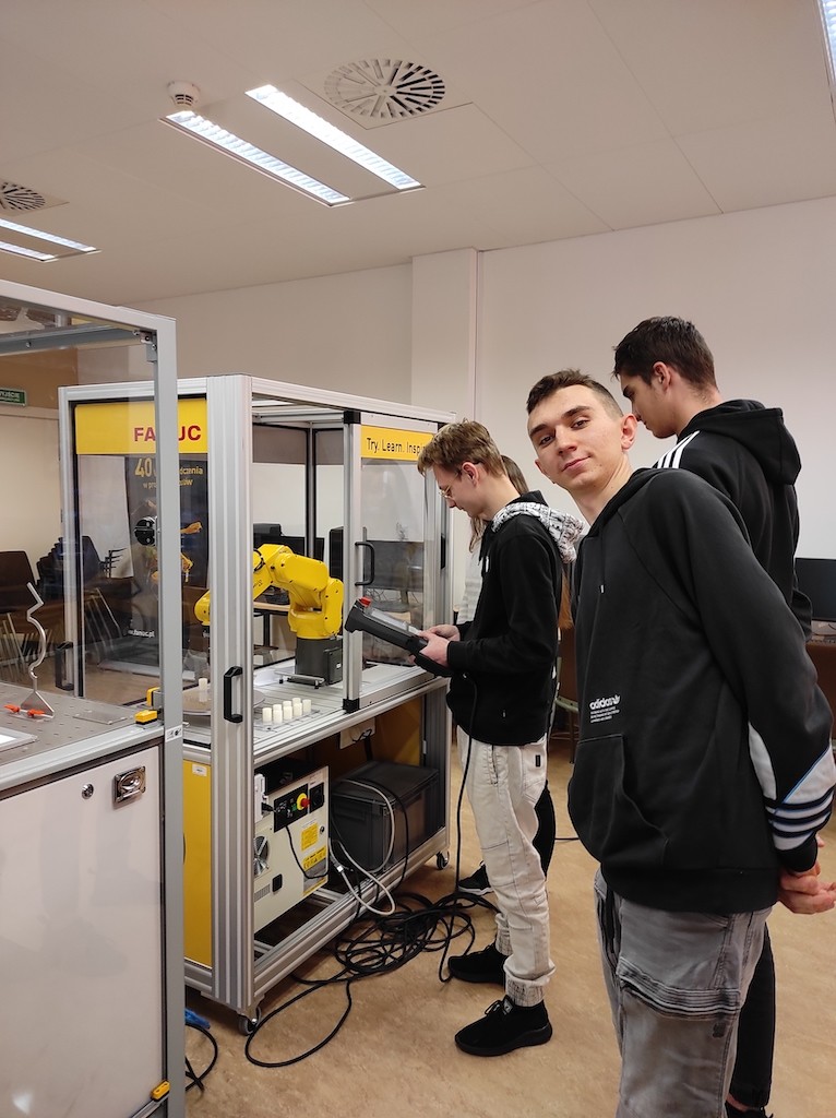 Dnia 21.10.2021 r. Ci sami uczniowie zapoznali się z podstawami obsługi robota przemysłowego dzięki uprzejmości i fachowemu wsparciu mgr. inż. Karola Łysiaka.