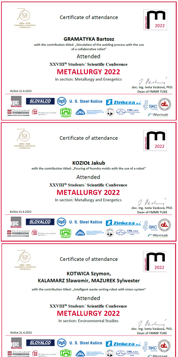 - Bartosz GRAMATYKA: Simulation of the welding process with the use of a collaborative robot; w grupie: metallurgy and energetics.