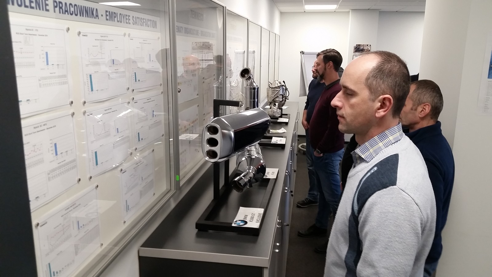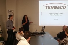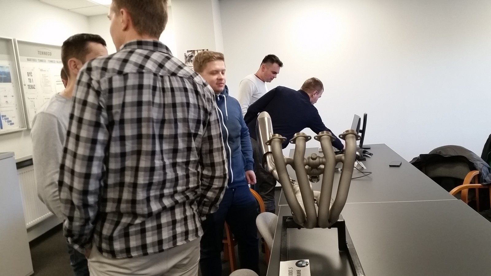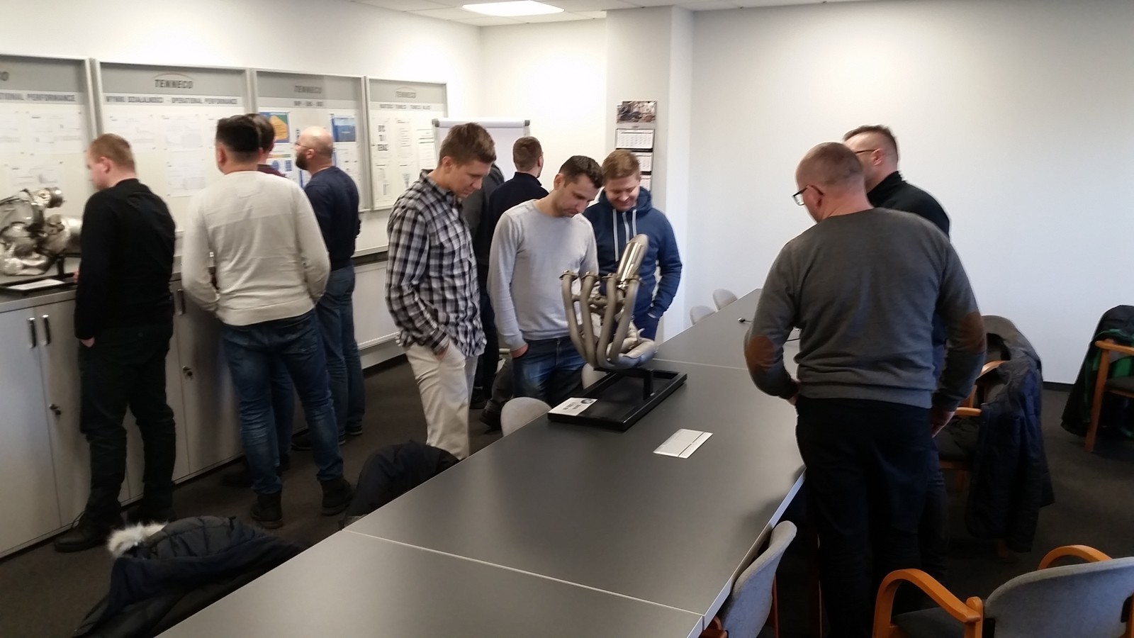 Wizyta w TENNECO AUTOMOTIVE POLSKA Sp. z o.o. składała się z trzech części: prezentacji multimedialnej firmy TENNECO, zwiedzania hali produkcyjnej oraz dyskusji. Dzięki uprzejmości kierownictwa firmy i jej pracowników możliwa była obserwacja produkcji kompletnych zestawów i układów wydechowych W przedsiębiorstwie główne technologie wytwarzania to spawalnictwo oraz przeróbka plastyczna blach i rur. Wymagający odbiorcy produktów firmy Tenneco przyczyniają się do ciągłego doskonalenia procesów produkcji układów wydechowych. Stąd też linie produkcyjne w firmie to zrobotyzowane stanowiska spawalnicze oraz zautomatyzowane linie montażowe. Zastosowana w TENNECO AUTOMOTIVE POLSKA Sp. z o.o. w Rybniku robotyzacja i automatyzacja procesów umożliwia skrócenie czasu wykonania poszczególnych operacji wytwarzania oraz uzyskanie wysokiej jakości produktów.