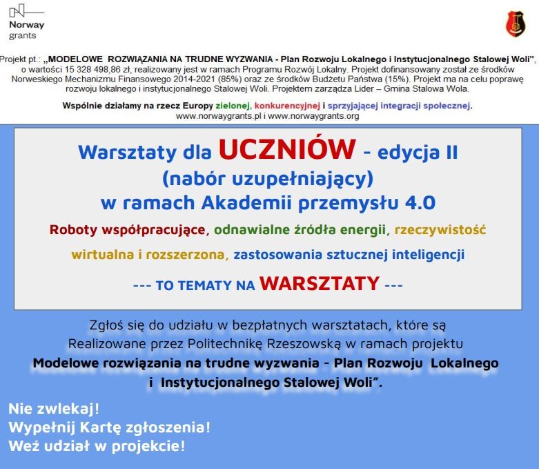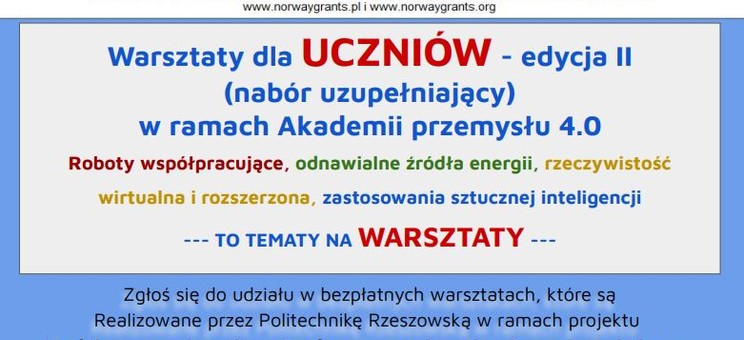 Zapraszamy do udziału w bezpłatnych warsztatach dla uczniów szkół ponadpodstawowych oraz podstawowych. Będą to zajęcia pilotażowe prowadzone w oparciu o przygotowane w ramach projektu materiały dydaktyczne oraz zakupiony sprzęt. W ramach tej edycji zajęcia będą realizowane w dwóch blokach tematycznych: Matematyka i Informatyka oraz Technika. Będą to zajęcia laboratoryjne, które w prosty i przystępny sposób pokażą różne zastosowania nauki i techniki w wielu dziedzinach naszego życia. Warsztaty mogą stanowić inspirację w poszukiwaniu rozwiązań problemów, z którymi spotykamy się w codziennym życiu stosując wiedzę oraz najnowsze osiągnięcia techniki. Dodatkowo zajęcia będą uzupełnieniem wiadomości oraz umiejętności zdobytych w szkole. Dzięki zakupionym w ramach projektu nowoczesnym urządzeniom uczniowie będą mogli przenieść się w świat wirtualnej i rozszerzonej rzeczywistości, wytworzyć czystą energię, zobaczyć czym jest sztuczna inteligencja, czy też poznać podstawy programowania robotów współpracujących.