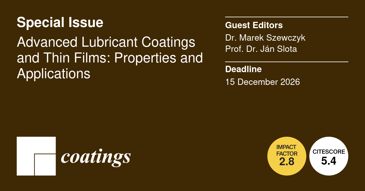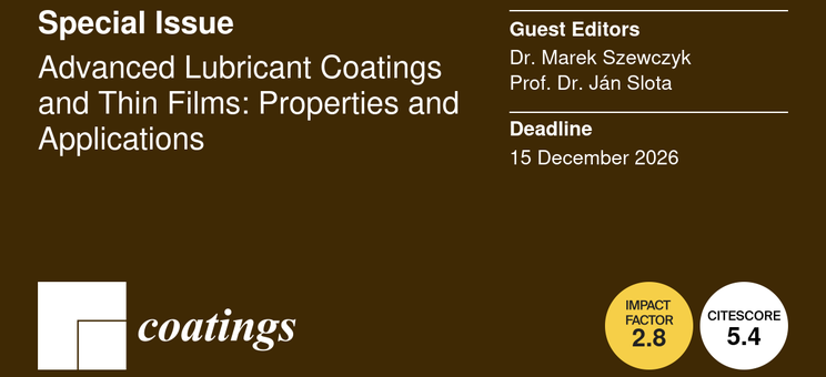 Zapraszam do publikacji artykułów w recenzowanym czasopiśmie Coatings w ramach wydania specjalnego zatytułowanego: Advanced Lubricant Coatings and Thin Films: Properties and Applications.