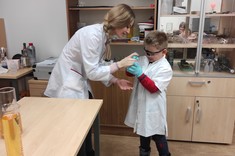 Podczas zajęć dzieci samodzielnie wykonywały żelki malinowe, następnie asystenci pomagali przy kolorowych cylindrach zmieniających barwy pod wpływem dodanych odczynników, karmieniu chemicznego potwora styropianowymi przysmakami, aktywowaniu magicznej kuli, która zmieniała kolor, dodawaniu odwagi chemicznemu kameleonowi, który nawet kilka razy zmienił barwę. Na zakończenie odbyła się degustacja lodowych chrupek kukurydzianych zmrożonych ciekłym azotem.