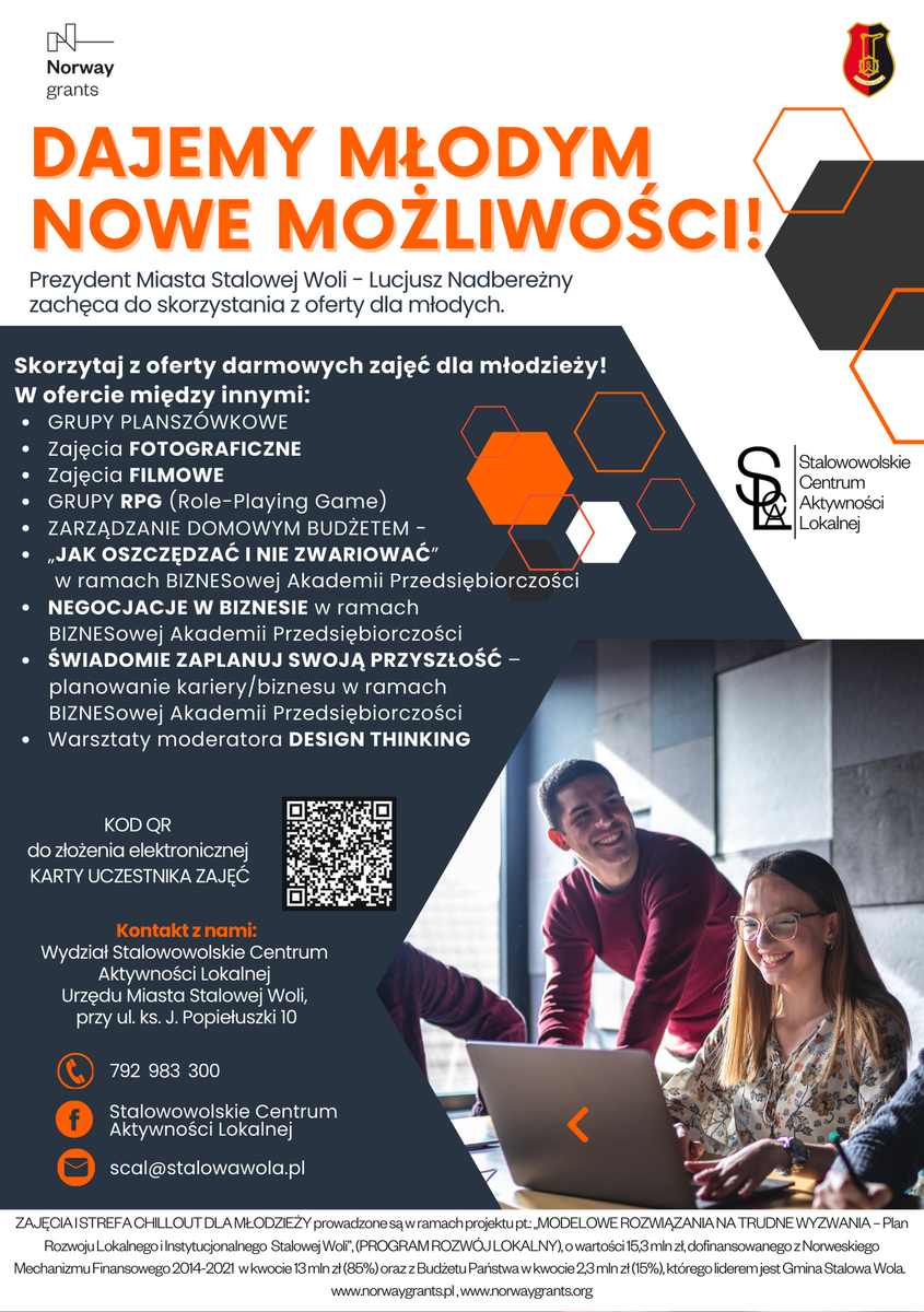 ZAJĘCIA DLA MŁODZIEŻY prowadzone są w ramach projektu pn.: „MODELOWE ROZWIĄZANIA NA TRUDNE WYZWANIA – Plan Rozwoju Lokalnego i Instytucjonalnego Stalowej Woli”, dofinansowanego z Norweskiego Mechanizmu Finansowego 2014-2021 (85%) oraz z Budżetu Państwa (15%) i wdrażanego w ramach Programu Rozwój Lokalny.