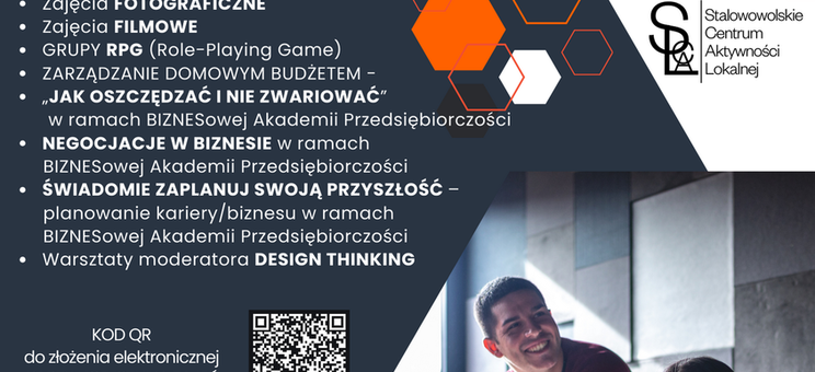 - ZAJĘCIA ŚWIADOMIE ZAPLANUJ SWOJĄ PRZYSZŁOŚĆ – planowanie kariery/biznesu w ramach BIZNESowej Akademii Przedsiębiorczości – 15 godzin x 2 grupy, każda max 15 os. (wiek uczestników: 14-29 lat, realizacja zajęć do 04.2024).