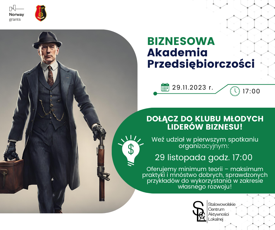 Z kolei dla szukających pomysłu na biznes, swojego miejsca w świecie zawodowym, inspiracji do działania, zapraszamy do pierwszej organizowanej przez Miasto Stalowa Wola AKADEMII PRZEDSIĘBIORCZOŚCI – BIZNESOWA. Oferujemy minimum teorii – maksimum praktyki i mnóstwo dobrych, sprawdzonych przykładów do wykorzystania w zakresie własnego rozwoju. Dołącz do Klubu Młodych Liderów Biznesu i zapisz się na: