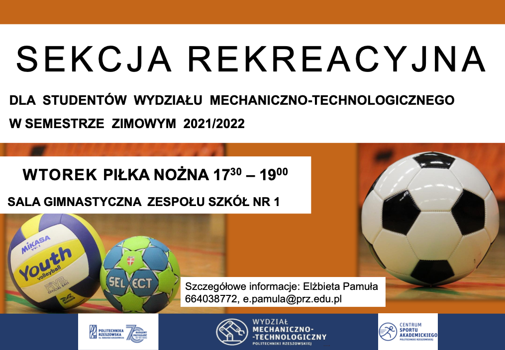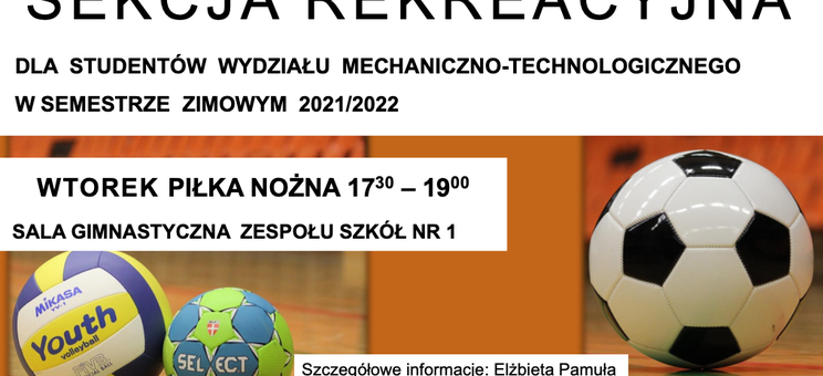 Zapraszamy wszystkich studentów Wydziału Mechaniczno-Technologicznego na zajęcia sekcji rekreacyjnej