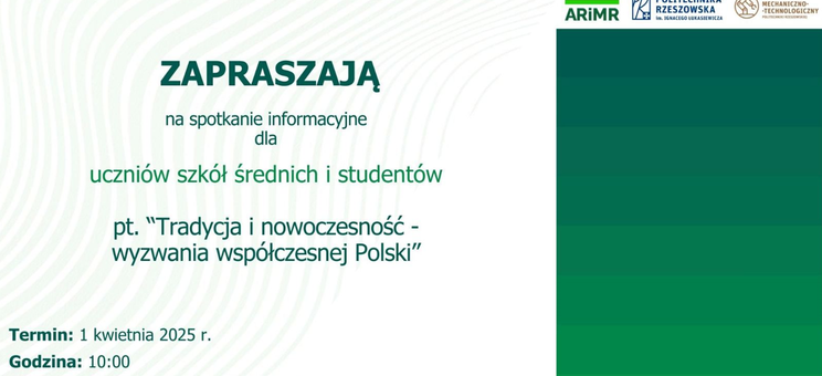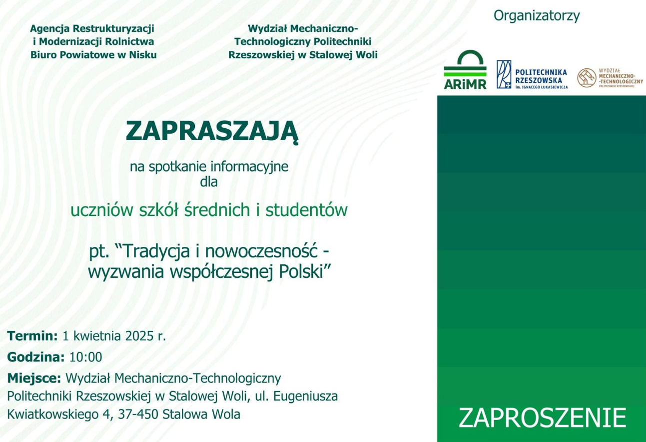 1 kwietnia o godzinie 10:00 na Wydziale Politechniki Rzeszowskiej w Stalowej woli odbędzie się wyjątkowe spotkanie pt. "Tradycja i nowoczesność- wyzwania współczesnej Polski". W spotkaniu wezmą udział przedstawiciele Agencji Restrukturyzacji i Modernizacji Rolnictwa oraz władze i wykładowcy Wydziału Mechaniczno- Technologicznego.