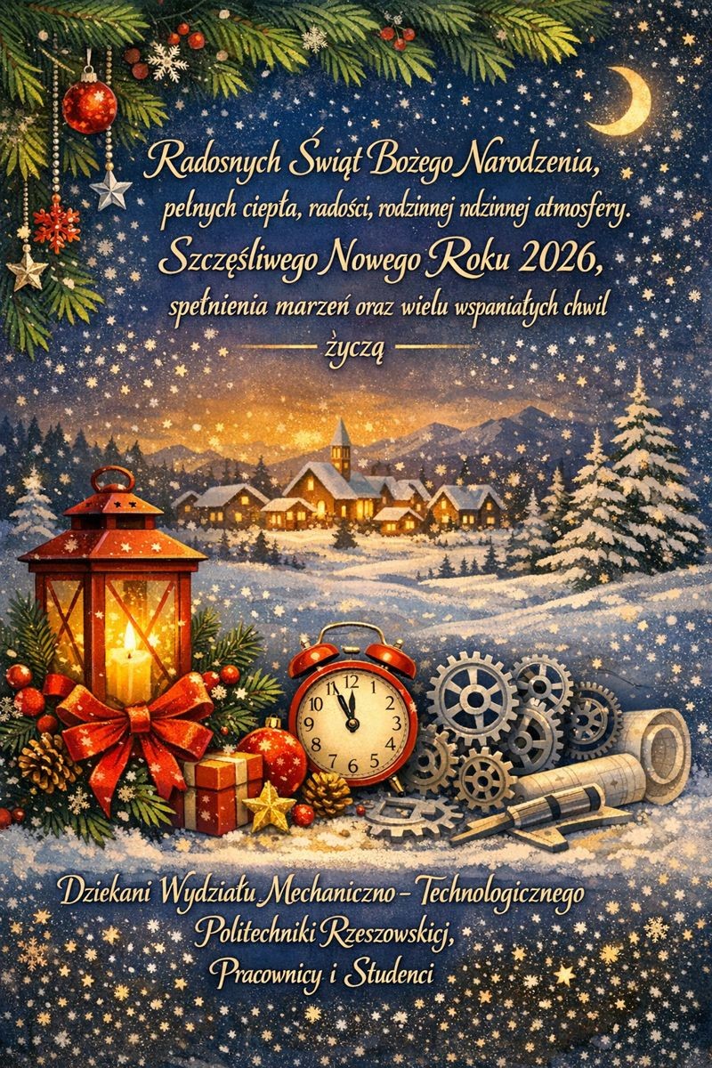 Radosnych Świąt Bożego Narodzenia, pełnych ciepła, radości, rodzinnej atmosfery. Szczęśliwego Nowego Roku 2026, spełnienia marzeń oraz wielu wspaniałych chwil życzą Dziekani Wydziału Mechaniczno- Technologicznego Politechniki Rzeszowskiej, Pracownicy i Studenci.
